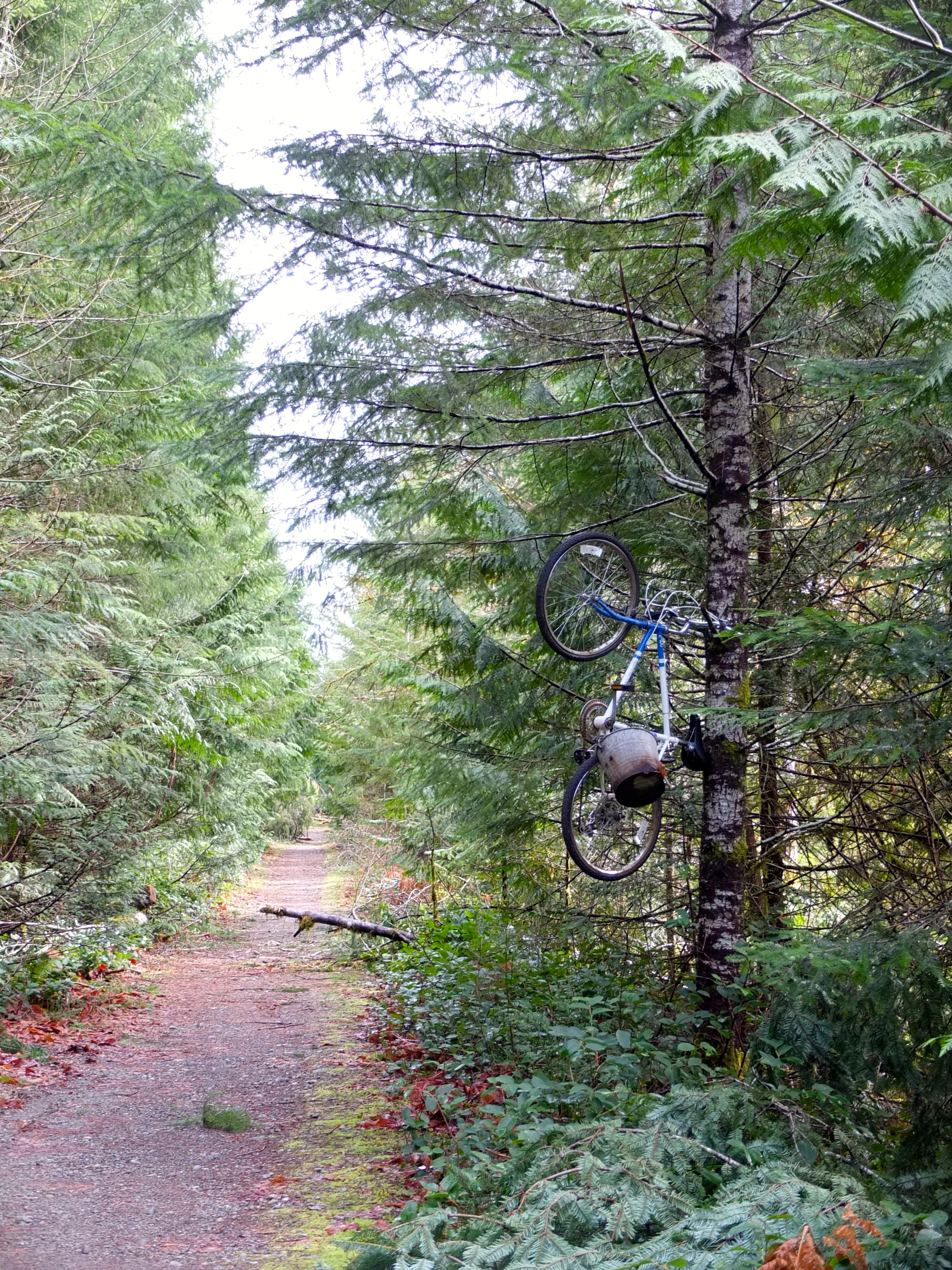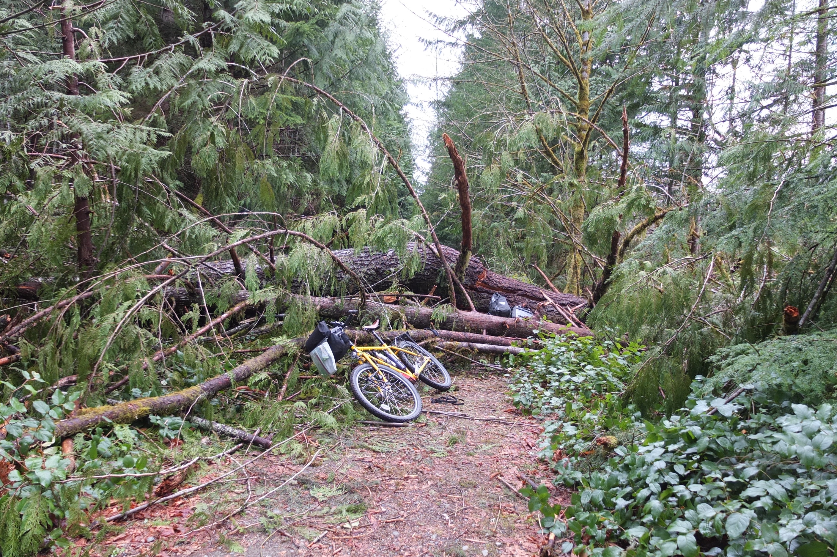Once I had passed the trestle, the trail weaved it’s way through the coastal woods and I was alone for most of the 40km to Lake Cowichan. As it is the off season, sections of the trail were not maintained. Several times I had to unload bike and ferry all of my gear across some fallen trees.