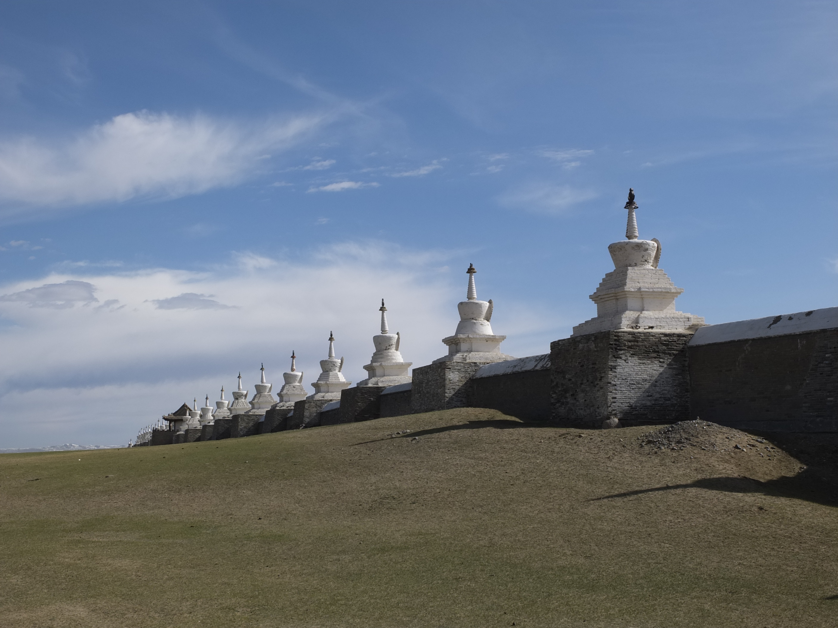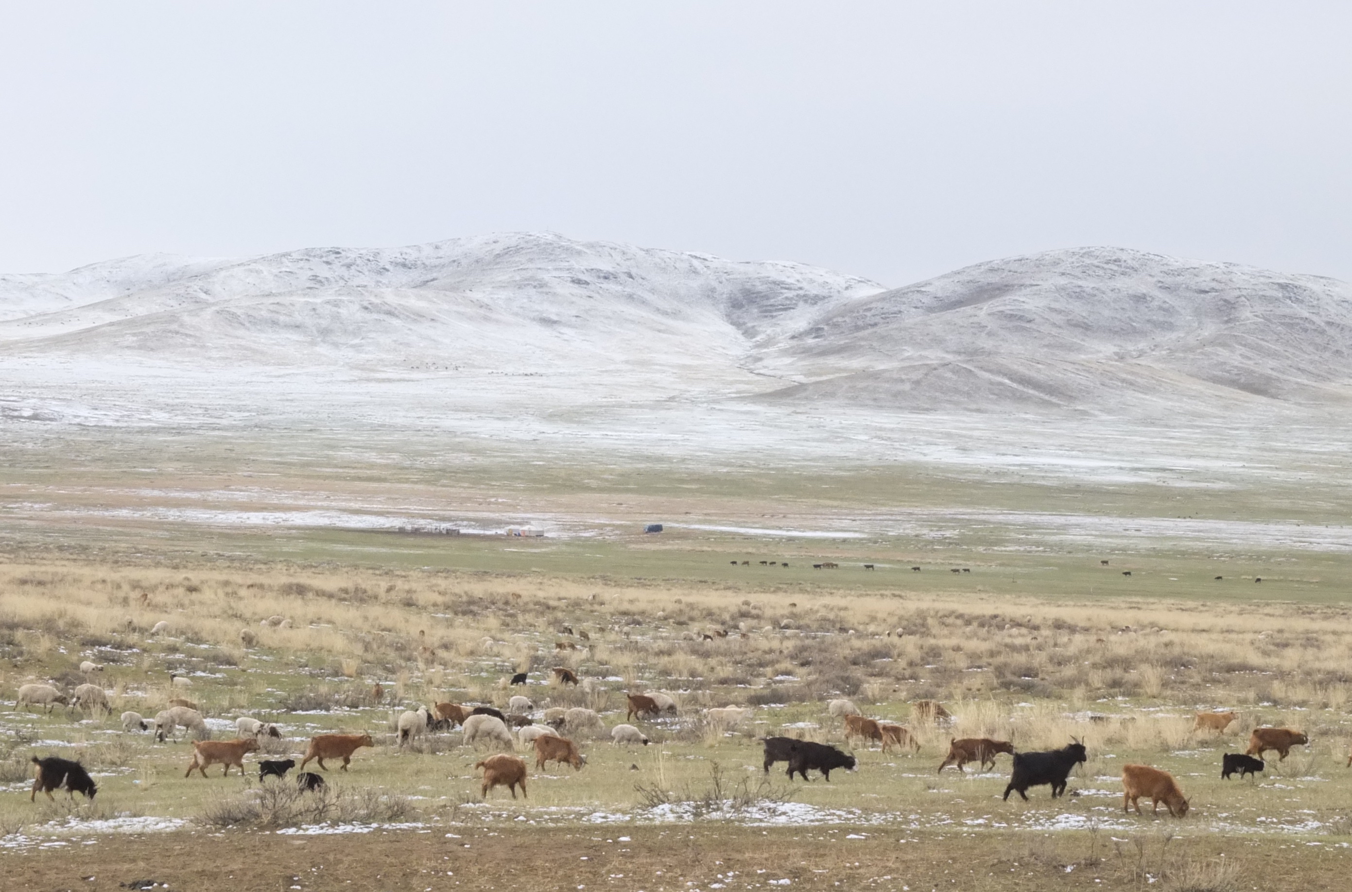 The road continuously climbed and descended through the mountains. Mountain passes are often marked by ovoos, a shamanistic offering to tengers, the sky gods. These large piles of rocks and sticks are wrapped with blue scarves, representing the sky. The gods are honoured by flicking drop of vodka into the air before drinking.