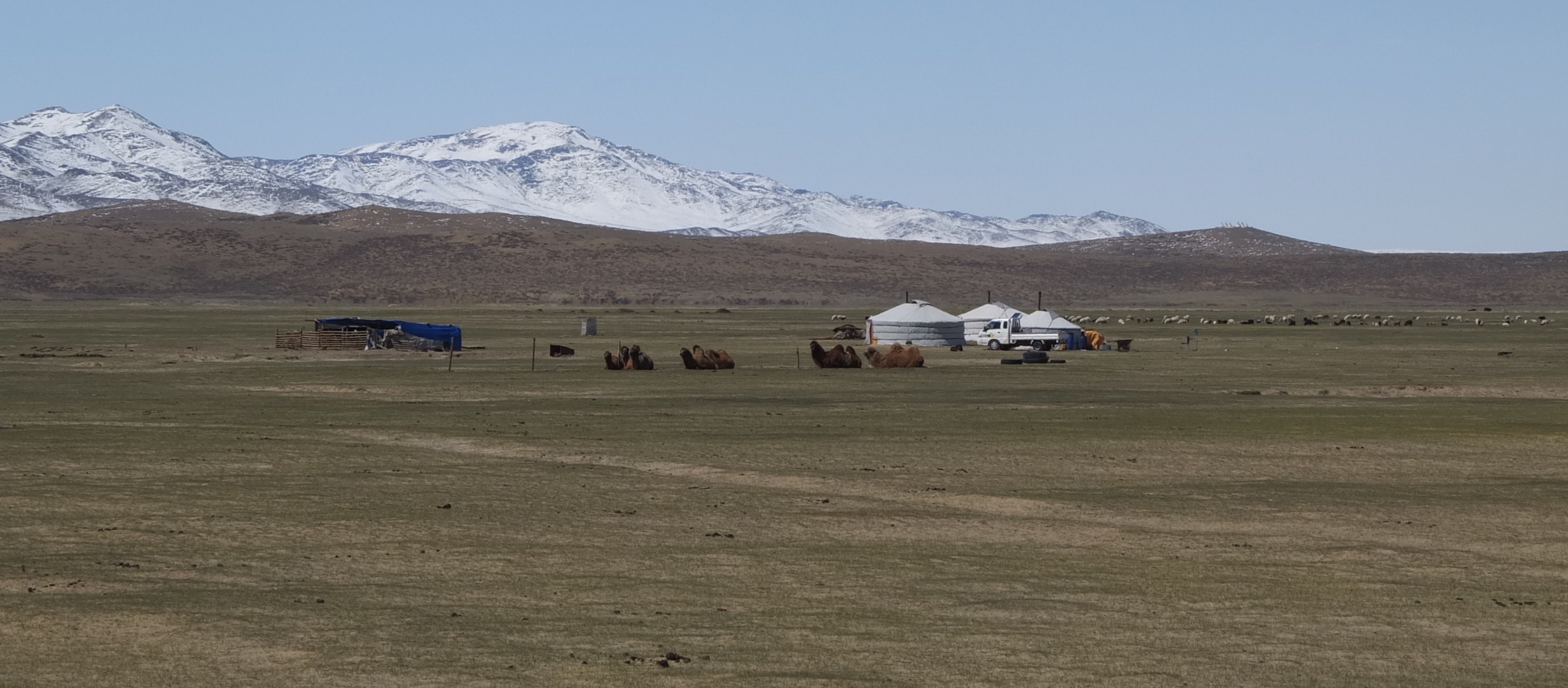 Then, about 25km from Khyargas Nuur – paved road! A unexpected surprise. It is a shame I couldn’t enjoy it as the wind once again fought against me the entire 60km along the salt lake. I would rather struggle through sand than struggle to go downhill on a pristine paved road. Instead of wallowing away in self pity, I did my best to enjoy the ride along the piercing blue lake. I passed groups of camels close to its shore and further down the road towards Ulaangom.