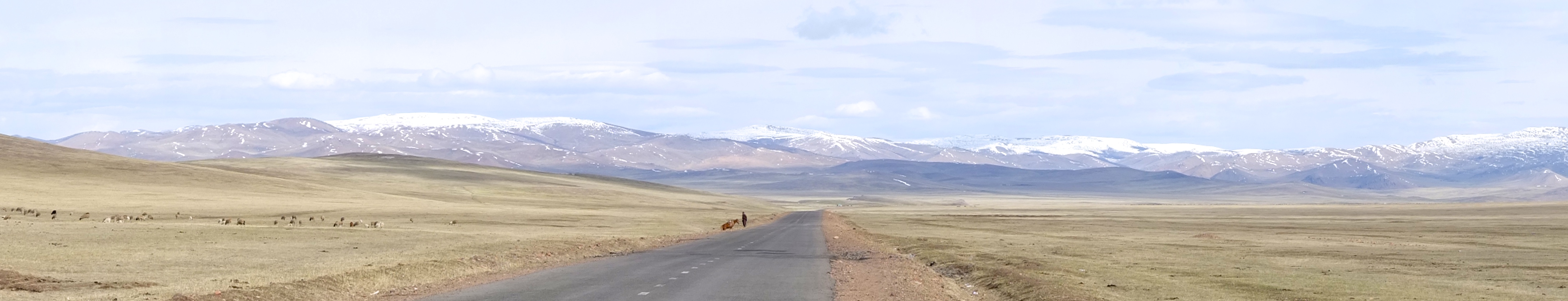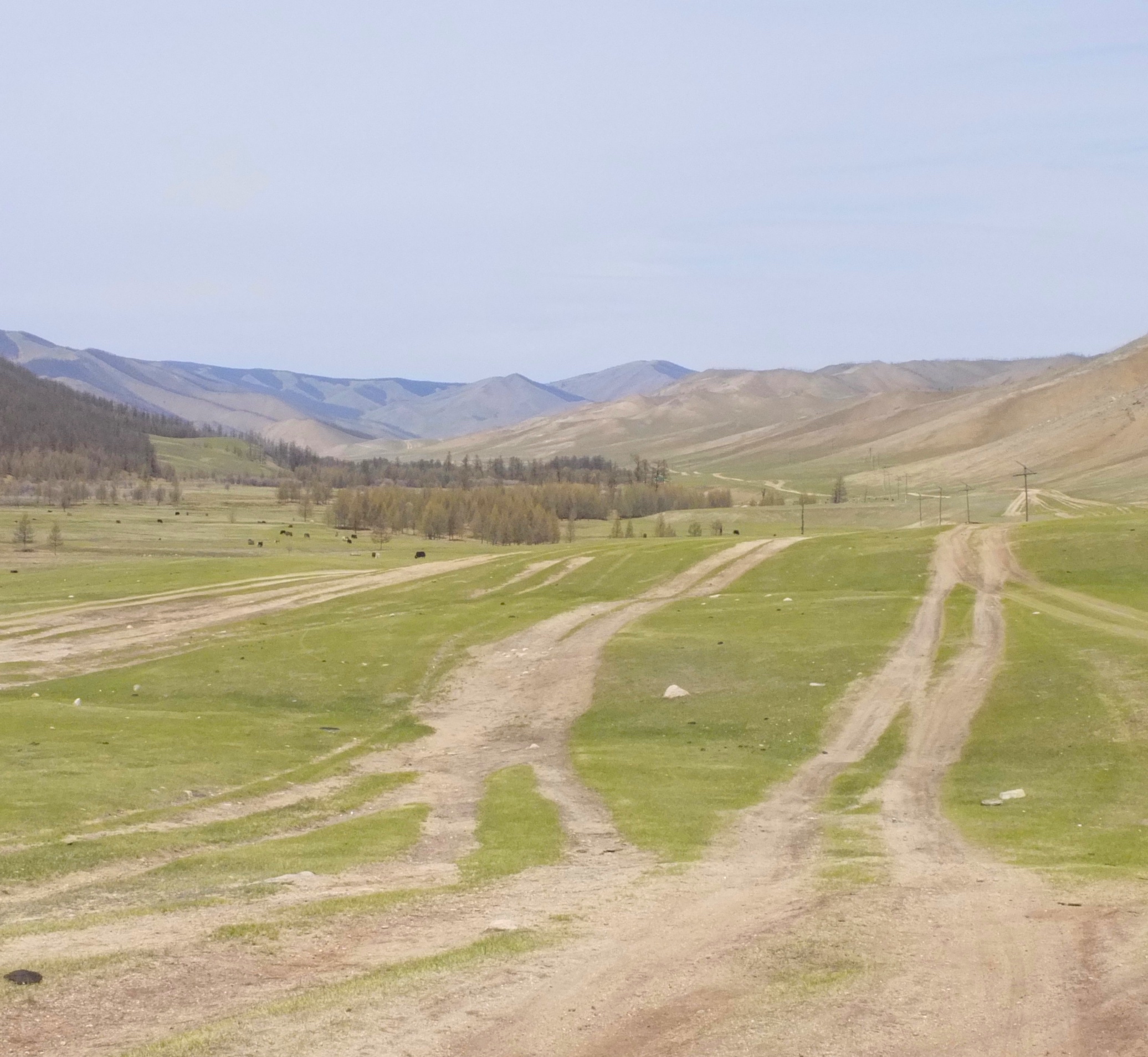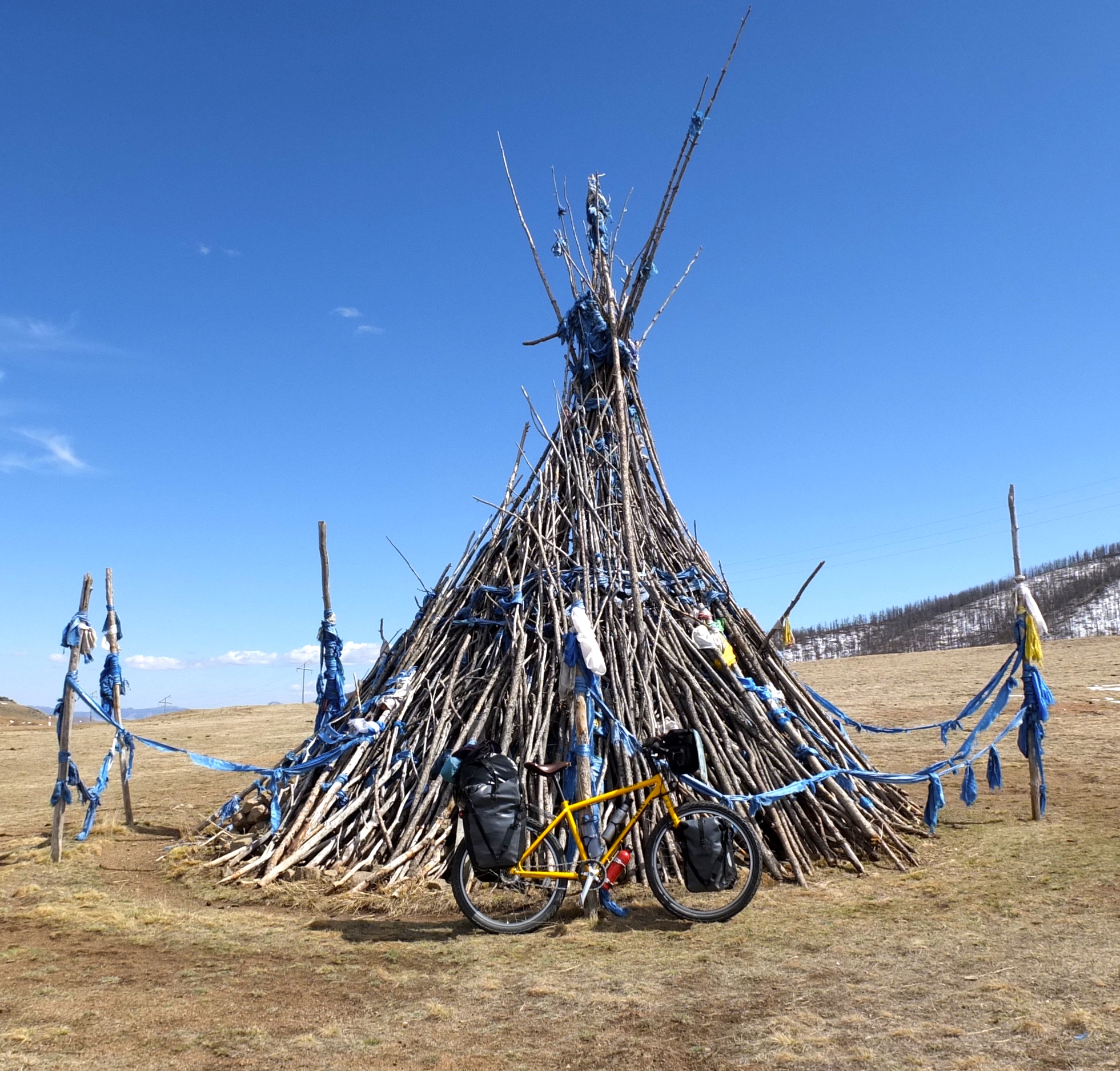 The road continuously climbed and descended through the mountains. Mountain passes are often marked by ovoos, a shamanistic offering to tengers, the sky gods. These large piles of rocks and sticks are wrapped with blue scarves, representing the sky. The gods are honoured by flicking drop of vodka into the air before drinking.