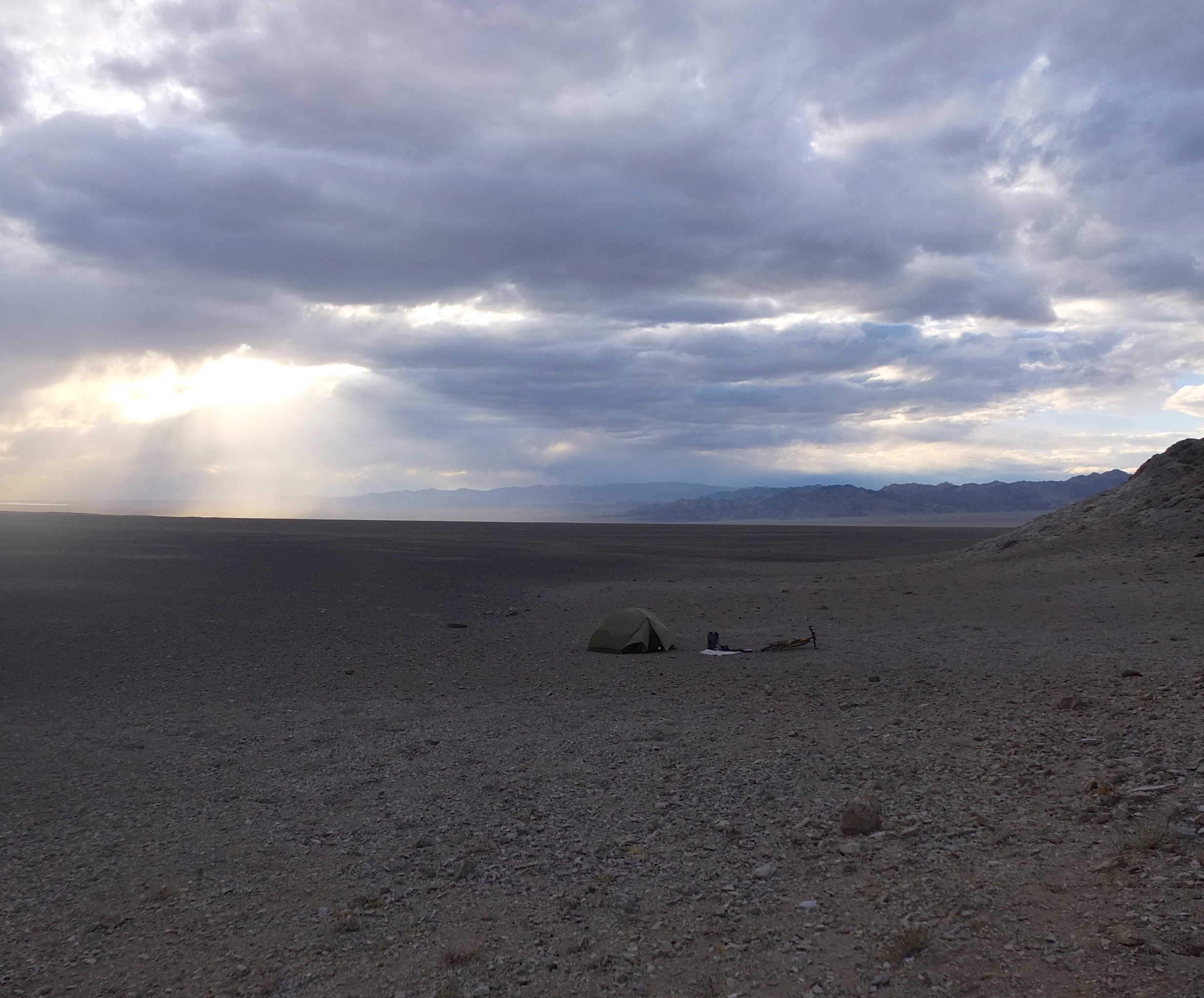 After an extended period of time in the desert, a lake is always a welcome sight. I camped right on the shore of Telmen Nuur close to some gers. As always, when I am in sight of ger, I was greeted by my friendly neighbours on a motorbike. They asked if I wanted to sleep in their ger, thinking that my paper thin tent wasn’t warm enough. Also it was hard to convince them that my gore-tex (actually, technically “e-vent”) jacket layered over thin merino wool was also sufficient. I can understand, seeing the the thick wool-lined coats that they wear, which would beat even the best brand of outdoor apparel. I politely declined their invitation, as was already set up for the night. My new friends hung around for a while, playing with my bike and checking all of its weird gadgets.