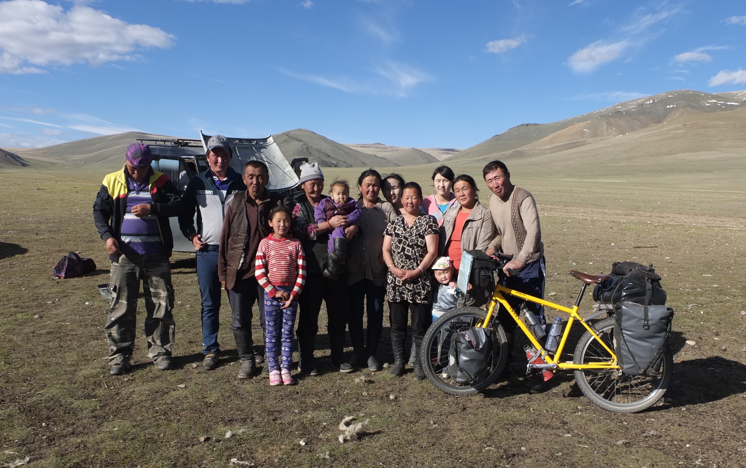 I dropped down into a beautiful valley and was soon spotted by a group of people near a ger. They waved for me to come over. After much ooohing and ahhing over my special letter “Ohhhhh, Tapa!” (Tara in cyrillic),this awesome and enthusiastic bunch let me take a photo of them. My “special letter” is a letter I have written giving details about me and my trip, which I have translated into Mongolian.