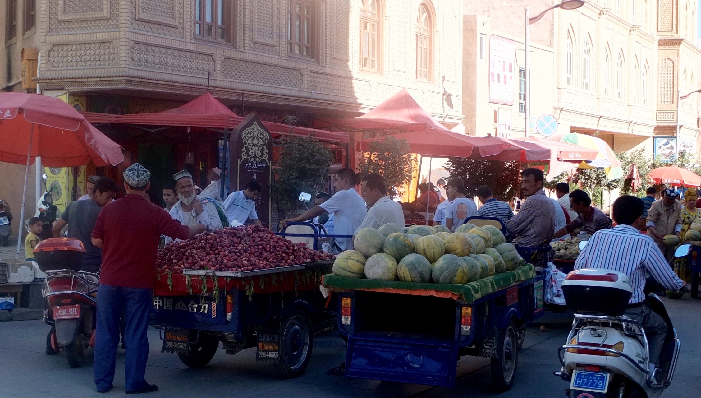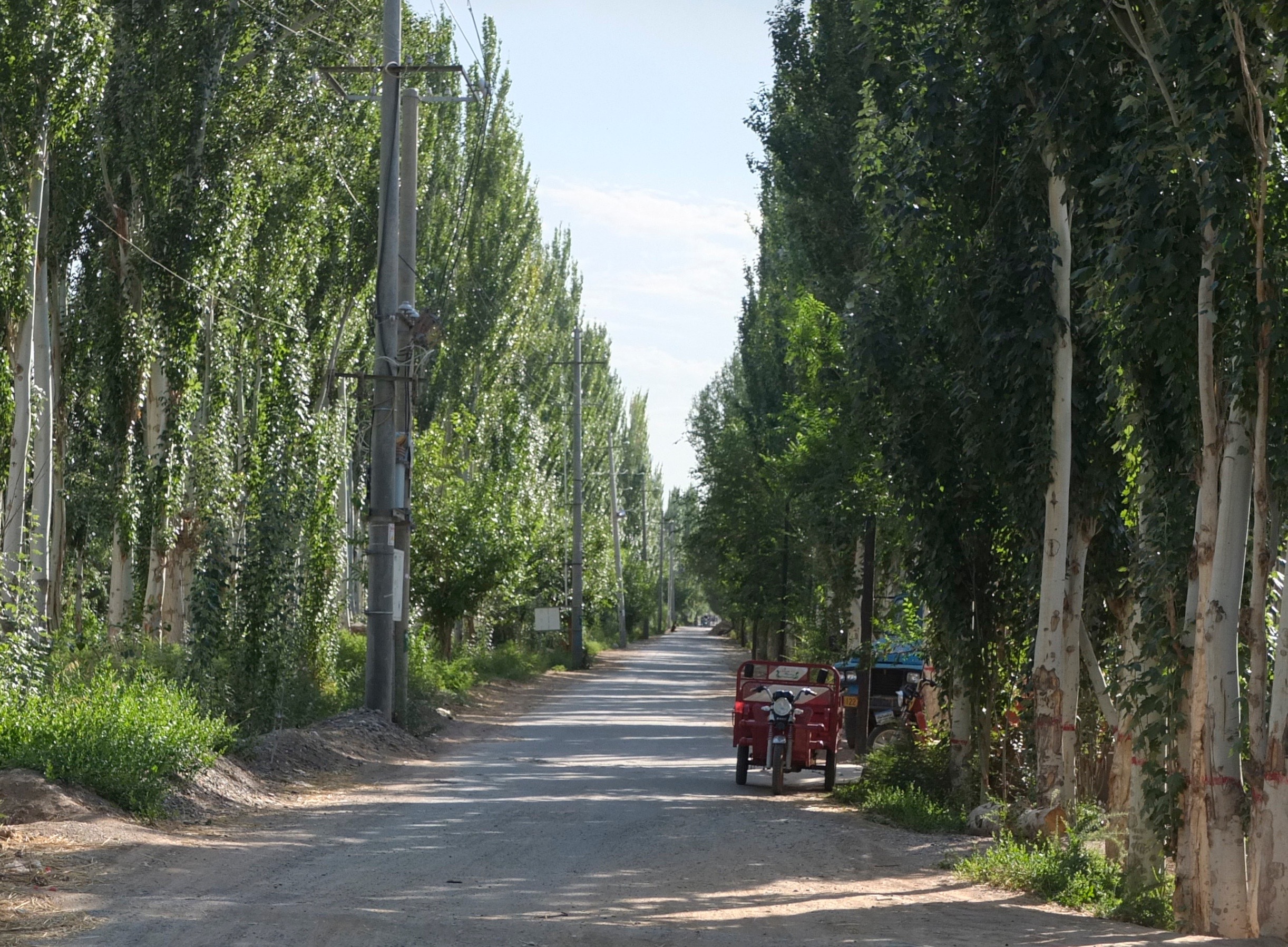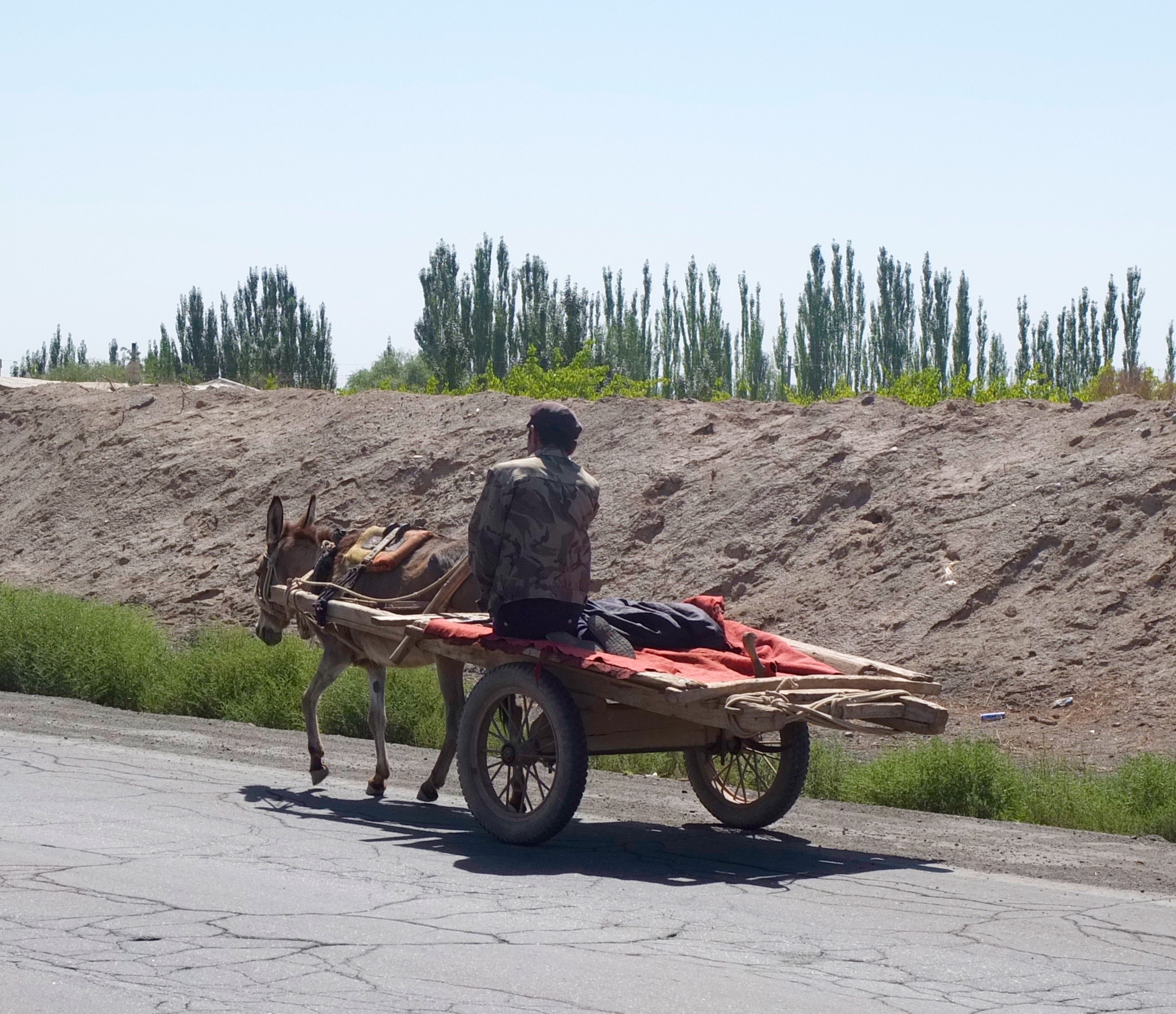 I tried to stay on the smaller roads that paralled the highway. These little poplar lined streets were like portals into the past. Leaving the modern highway, I was soon pedalling beside little old men riding donkey carts. These two worlds existed parallel to one another and couldn’t be more different. If was on these backroads, resisting the modern world that one could see traditional Uyghur life unfold.