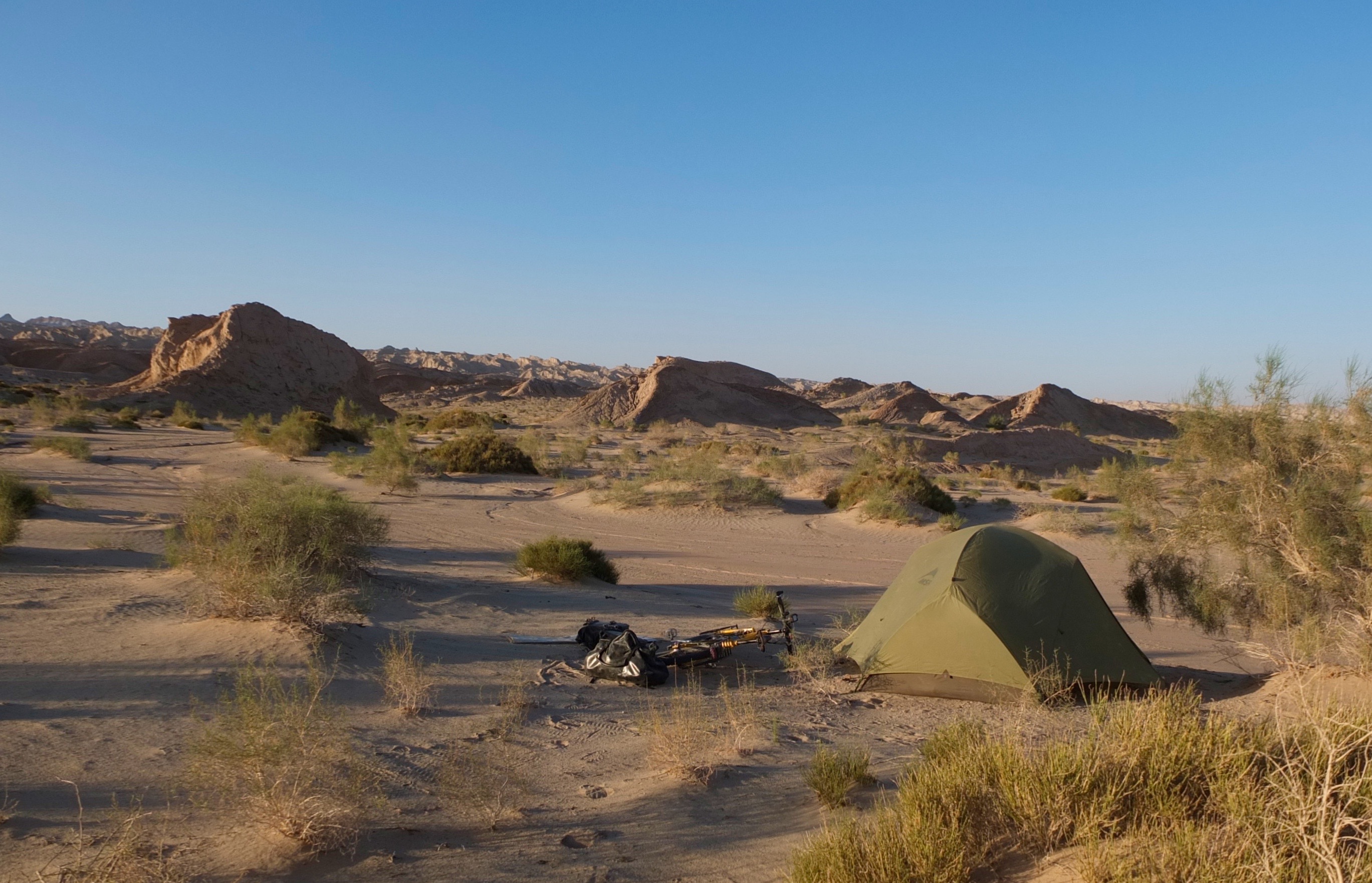 Despite my run-in with the police, I still camped most of the way to Kashgar, but I had to be discreet. From the ugly city of Kuqa I was cycling very long days – covering around 160km and stopping around 9:30pm to camp. I had some of the most “interesting” campsites to date. One night I found a gap in the barbed wire fenced along the road and ran with my bike towards some hills near hydro towers. It was about 500m of pushing frantically out in the open until I could get out of sight. That night a crazy thunderstorm raged in the distance and I was certainly glad it didn’t come any closer. On my ride across to Kashgar, I definitely experienced some extreme weather. At least once a day there was a short, but powerful thunderstorm. Then, mixed with a sandstorm, created another beast altogether.