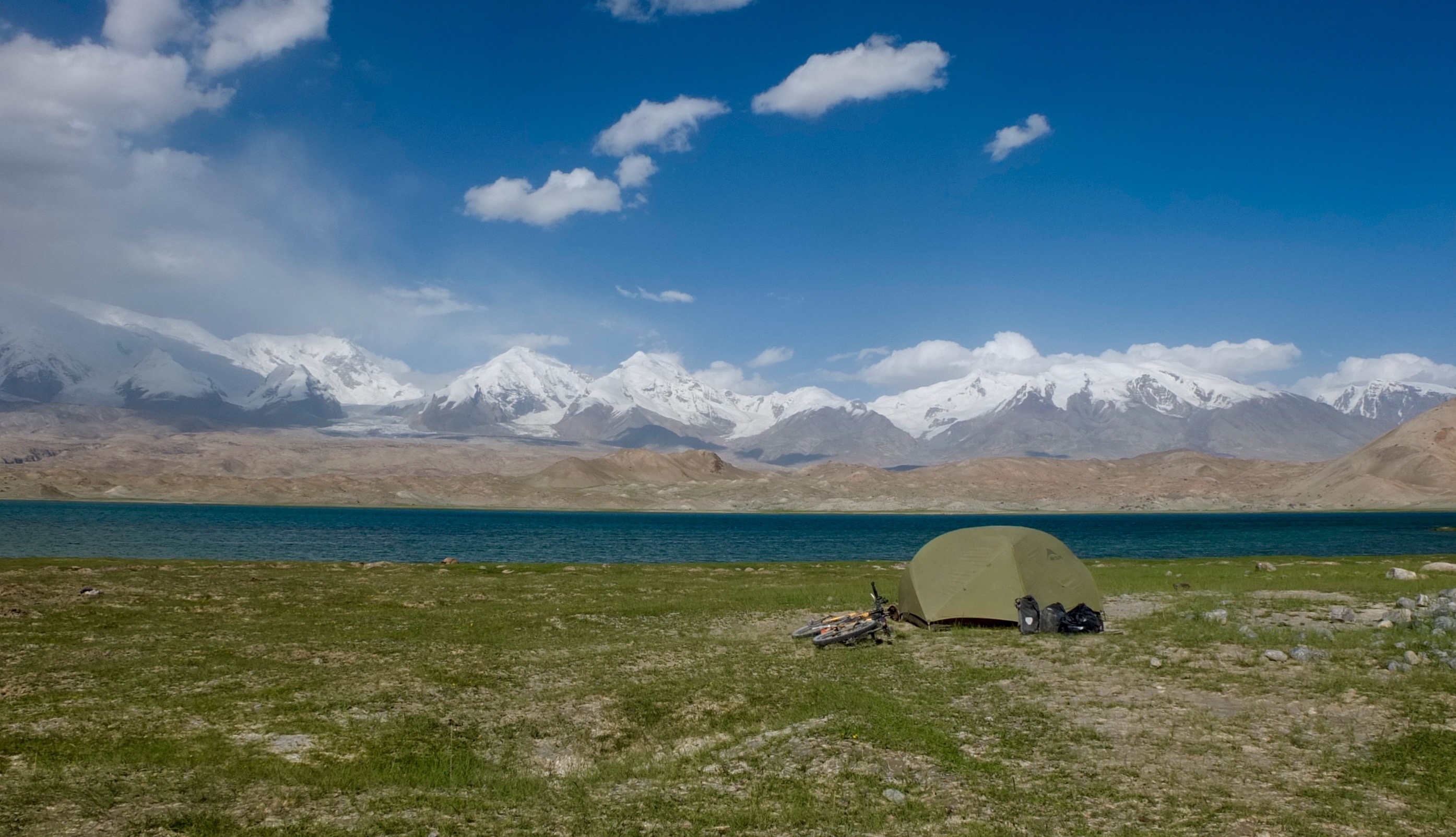 This continued all the way to stunning Karakul Lake at over 3000m, surrounded by Kyrgyz yurts. The locals were friendly if a bit pushy, with many boys approaching me on motorbikes trying to get me to stay in their yurts. Eventually I agreed to pay for dinner and breakfast in a yurt and pitched my tent near the shore of the lake. The cool temperature was a relief after the scorching heat of Kashgar. I slept very well that night.