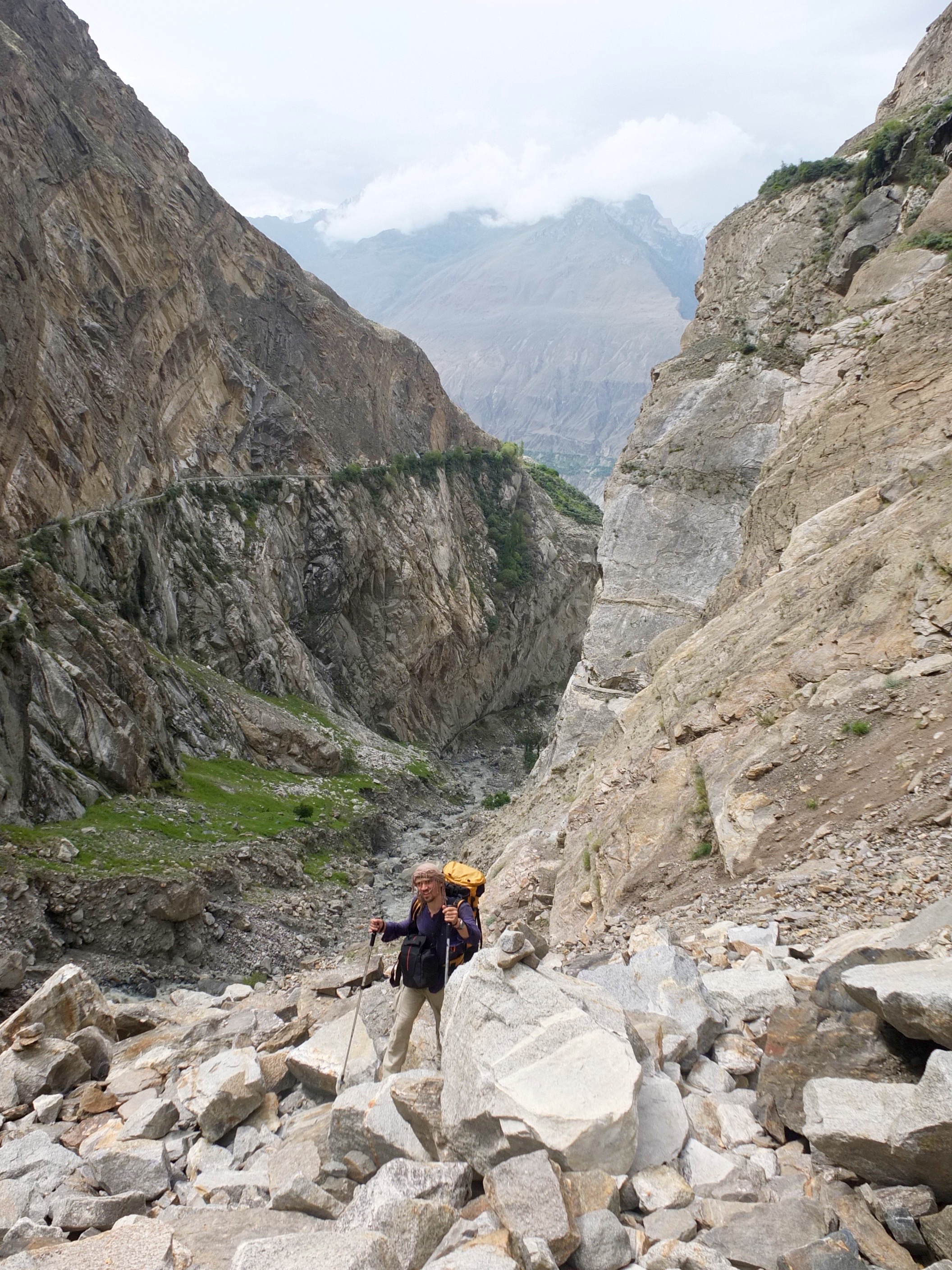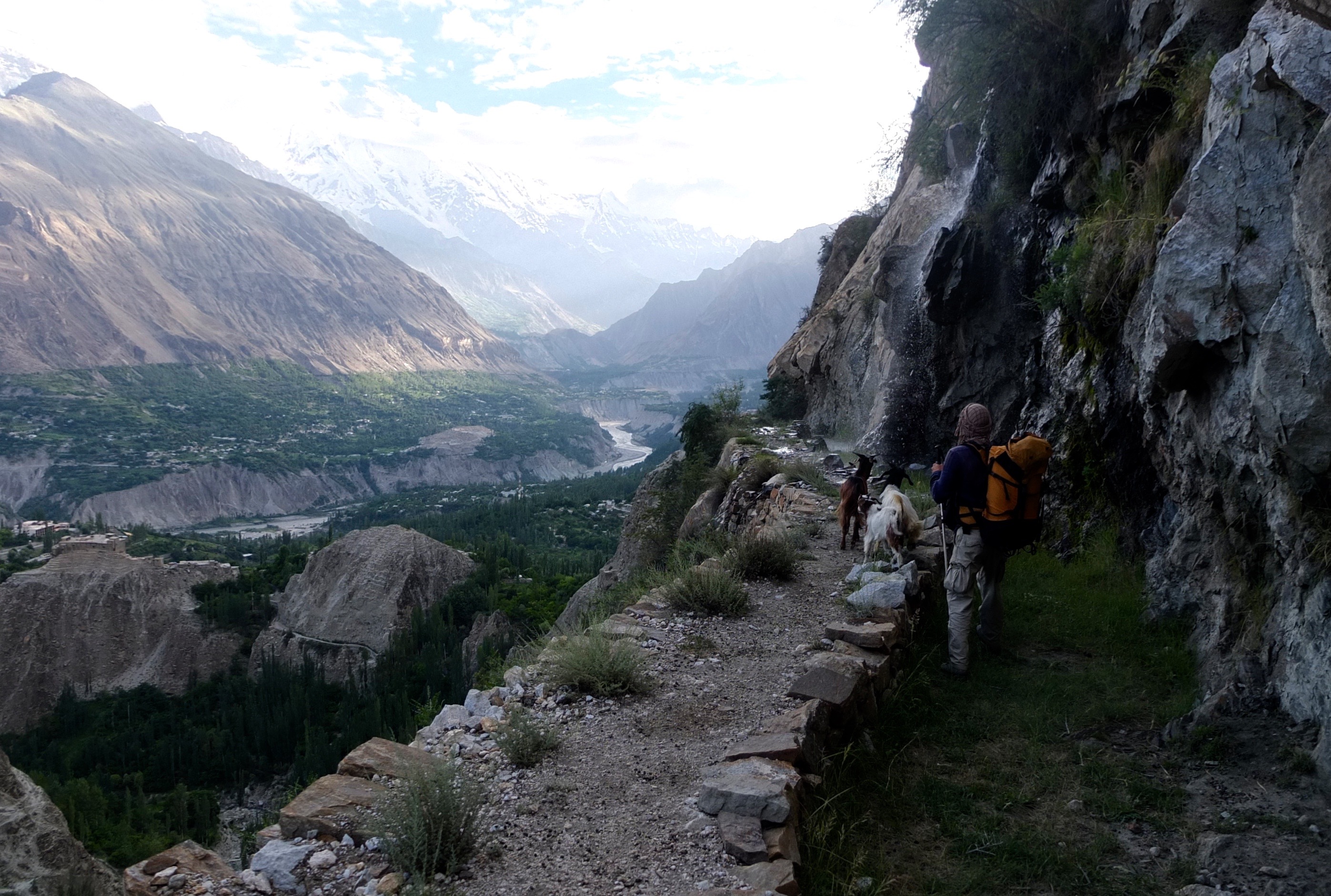 It was a very hot morning and we started the long ascent to Rakaposhi base camp. The higher we climbed, the cooler the air became. We were surrounding by steep hillsides of small conifers.