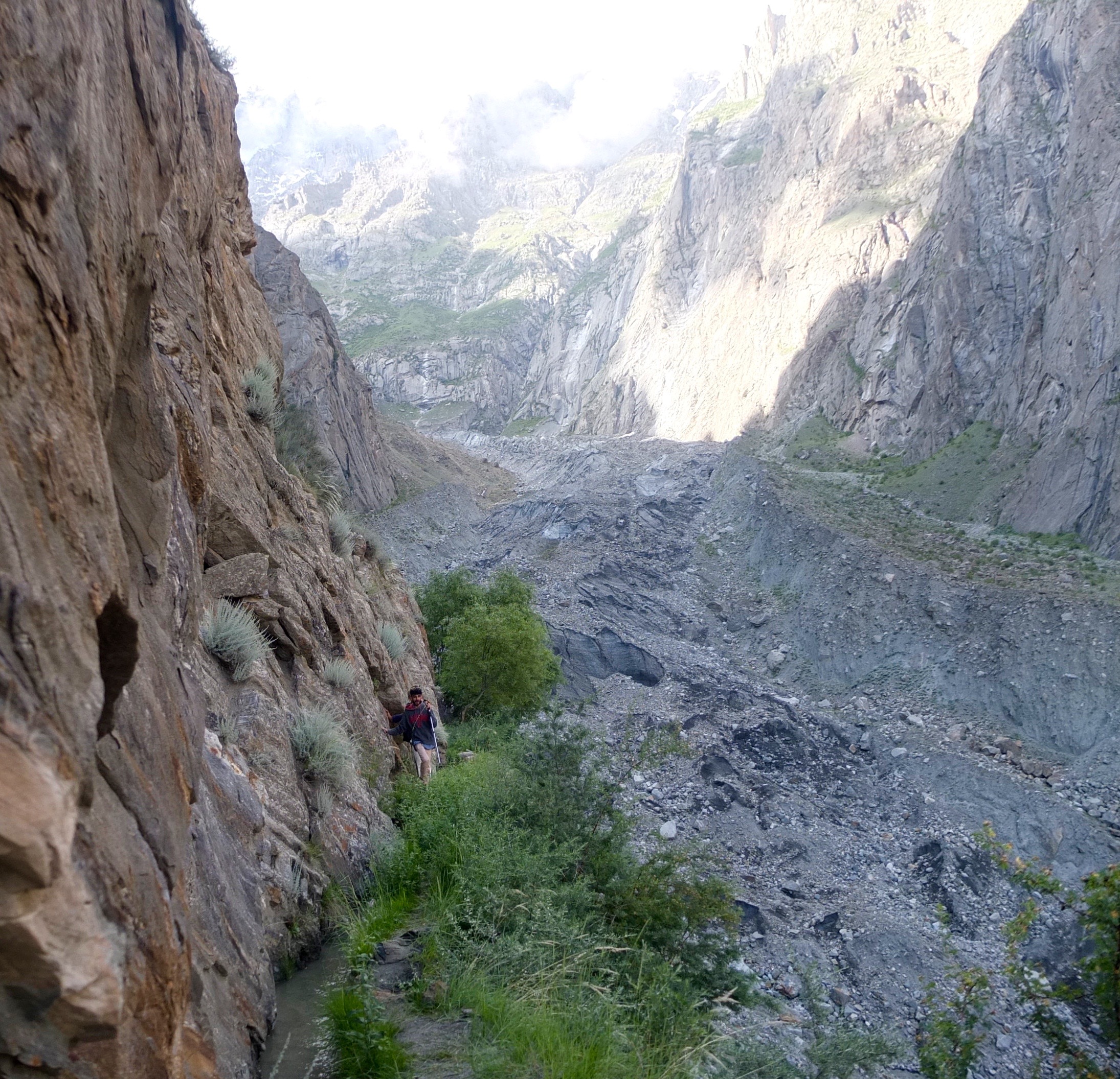On the way back we met some people from the previous night at Rakaposhi base camp. They also had trouble finding their way and navigating around the crevasses. My legs grew increasingly heavy and it was tough knowing that we still had a long descent back to Minapin. We arrived back at base camp in the early evening, our guide collapsing onto the grass near his friends. We gave him a few rupees and thanked him. It was a challenging but thrilling experience to cross a glacier. Before our journey back, we were given some instant noodles by a local – the famous “Maggi” brand that was found all over Pakistan. If we had wanted to stay for dinner, he would feed us also. The kindness of Pakistani people was never ending. We said our goodbyes and started the knee-knackering hike down to Minapin.
